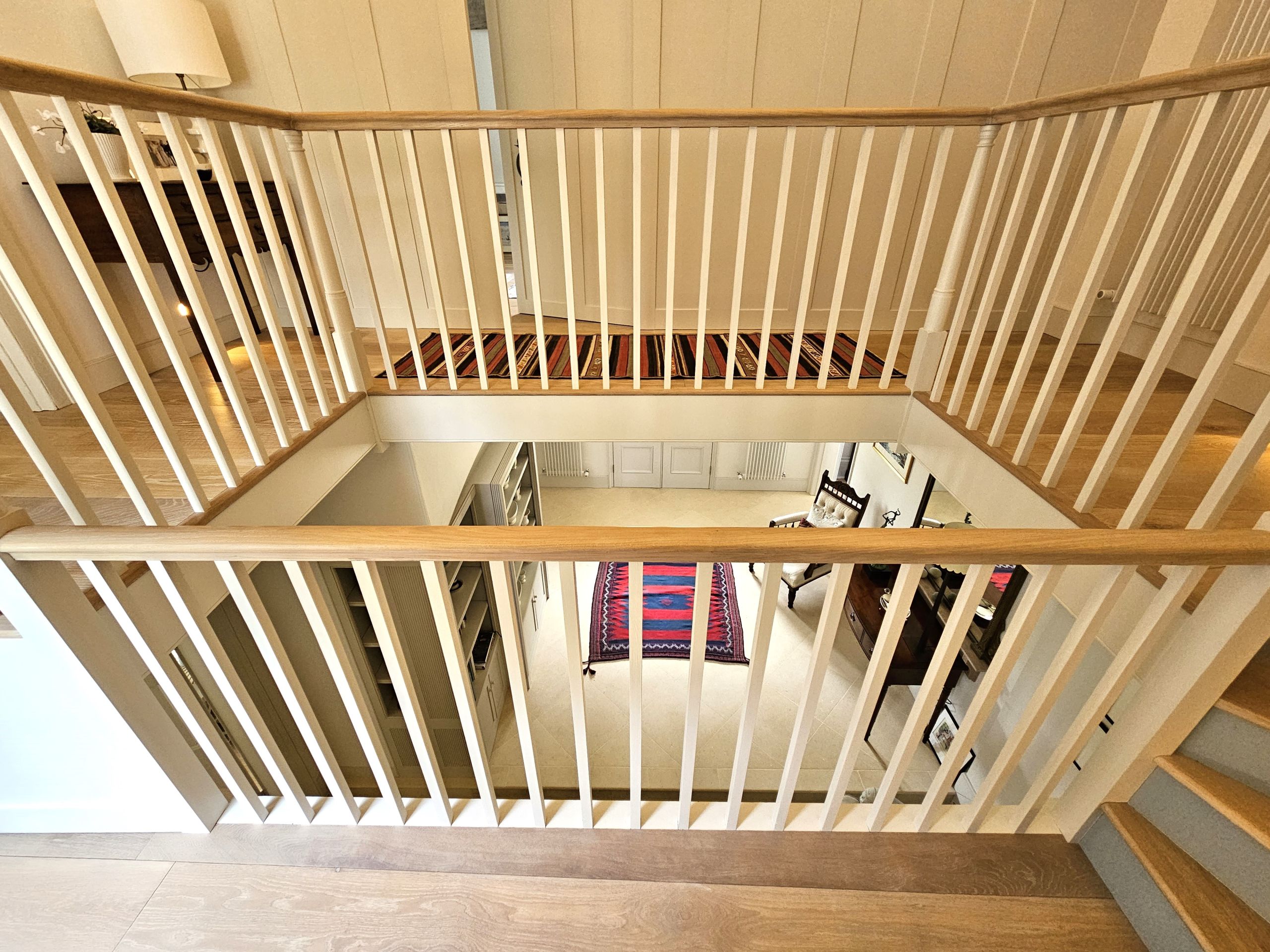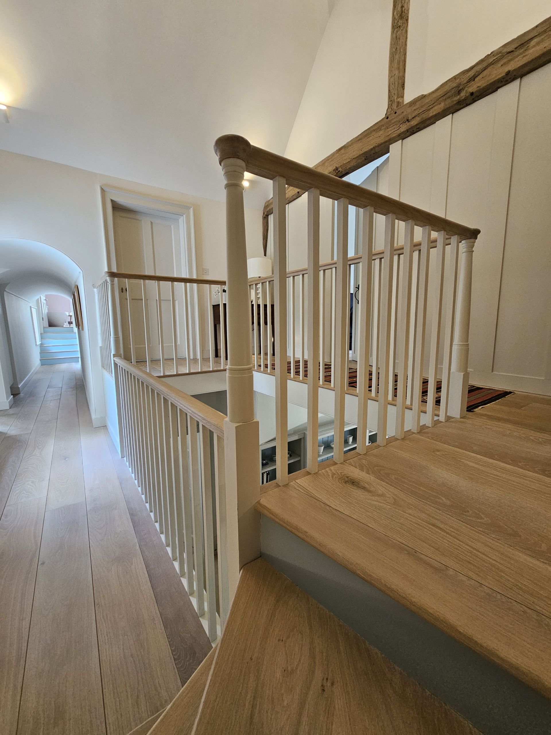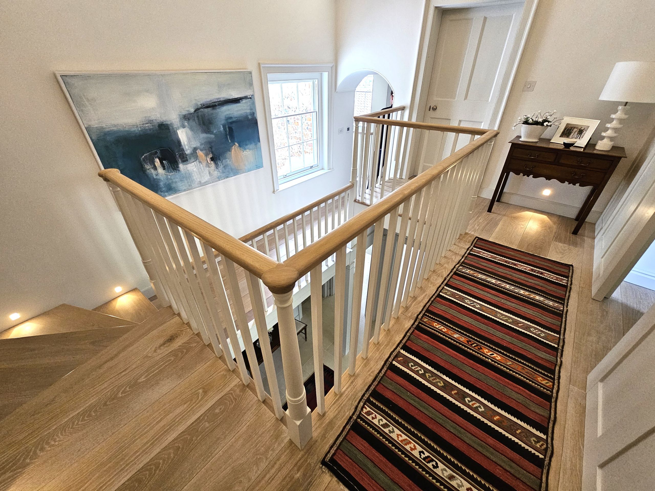 The bespoke gallery has painted balustrades and risers, finished with Oak treads and handrail. The contrast of painted and timber finishes gives this whole area a light and airy feel, without taking away from the character of the property.