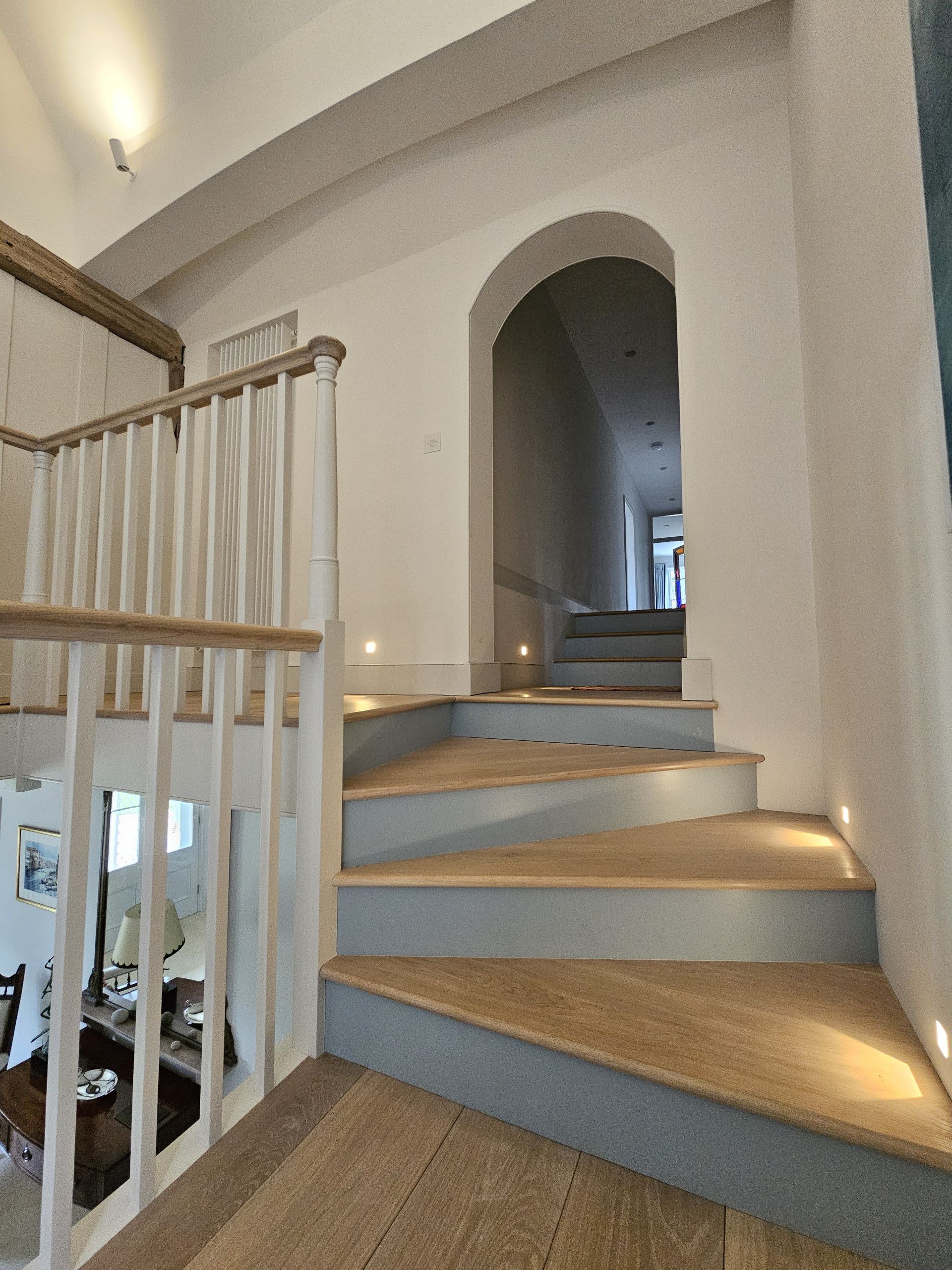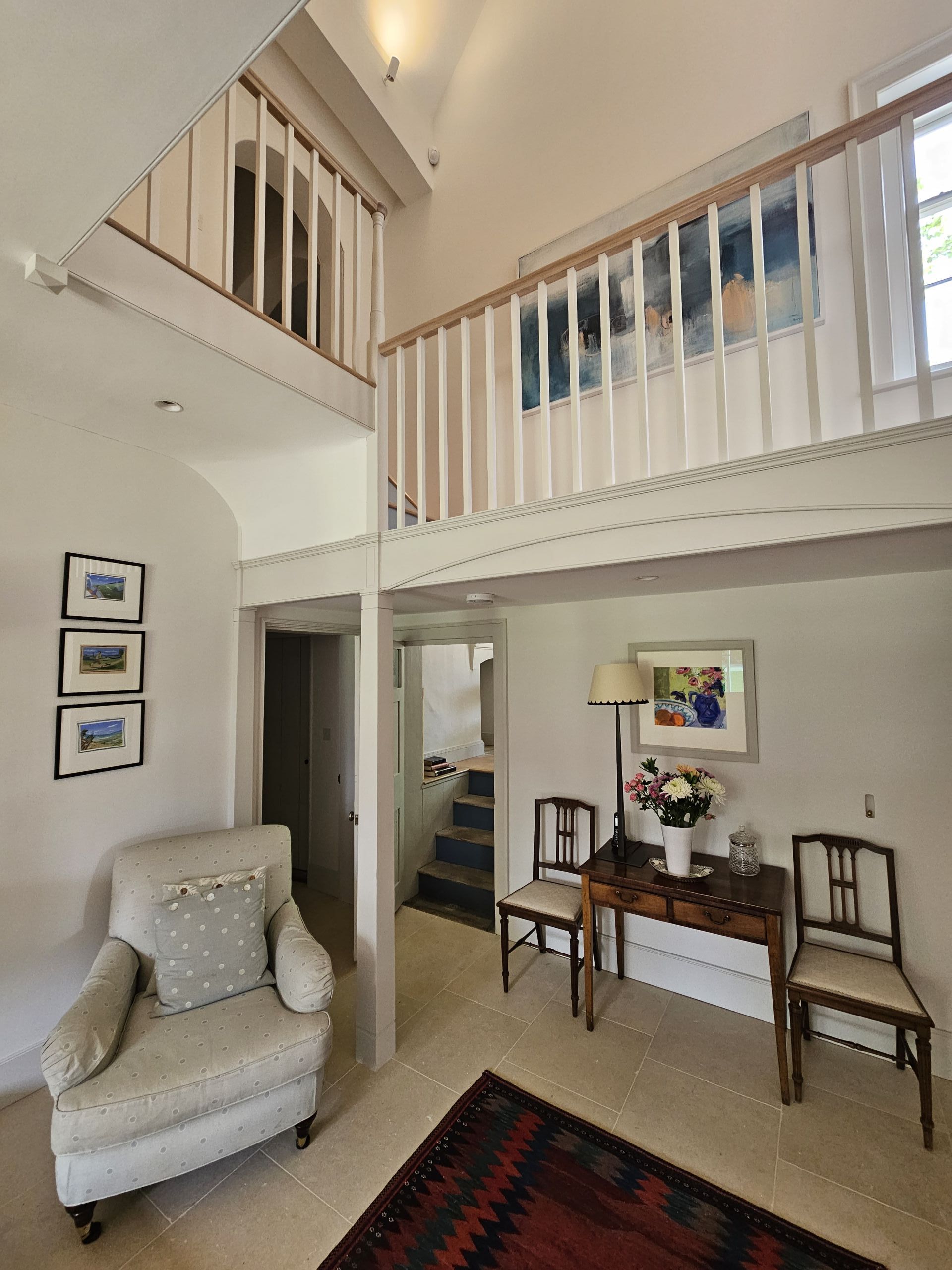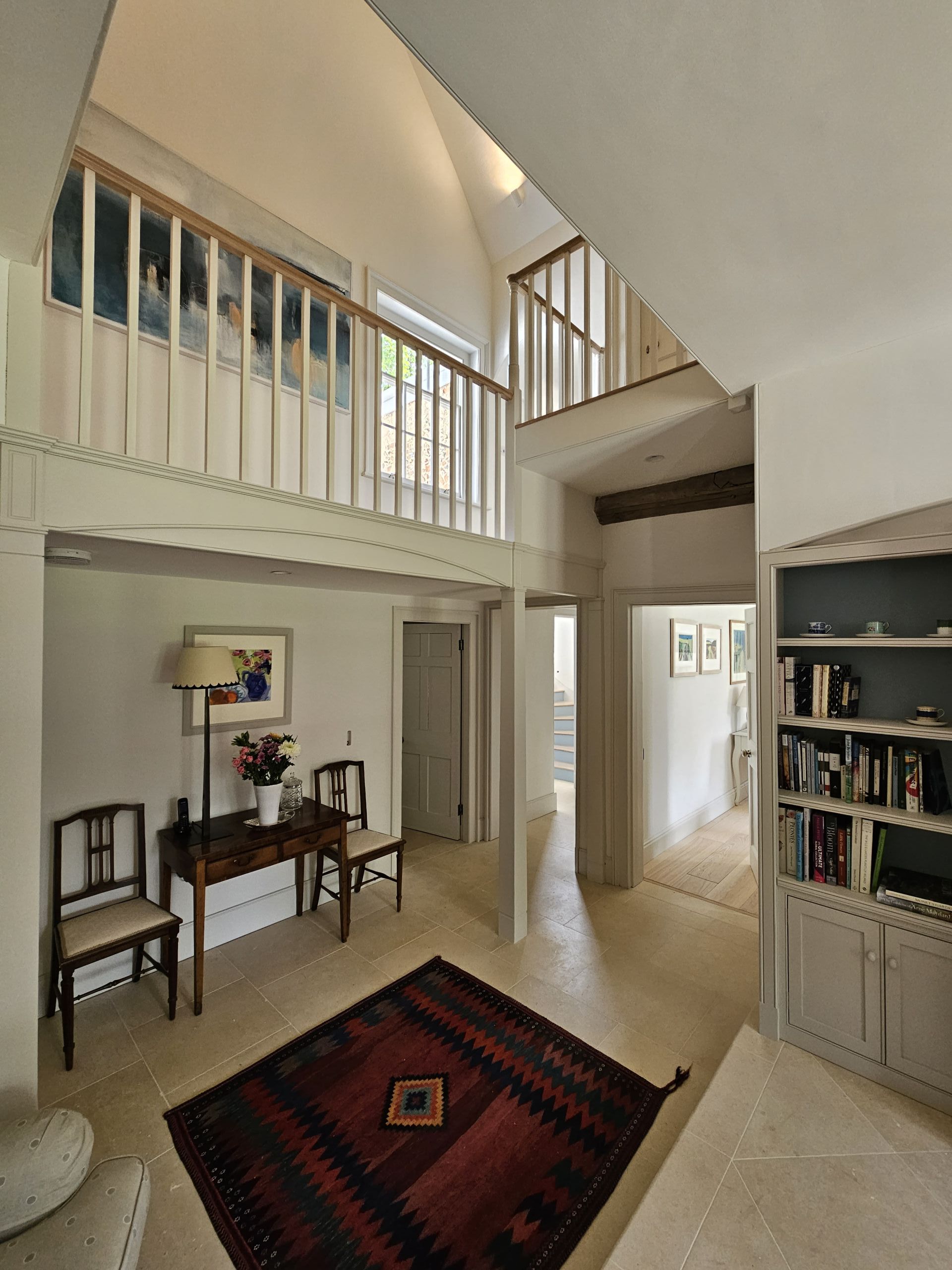 The bespoke gallery has painted balustrades and risers, finished with Oak treads and handrail. The contrast of painted and timber finishes gives this whole area a light and airy feel, without taking away from the character of the property.