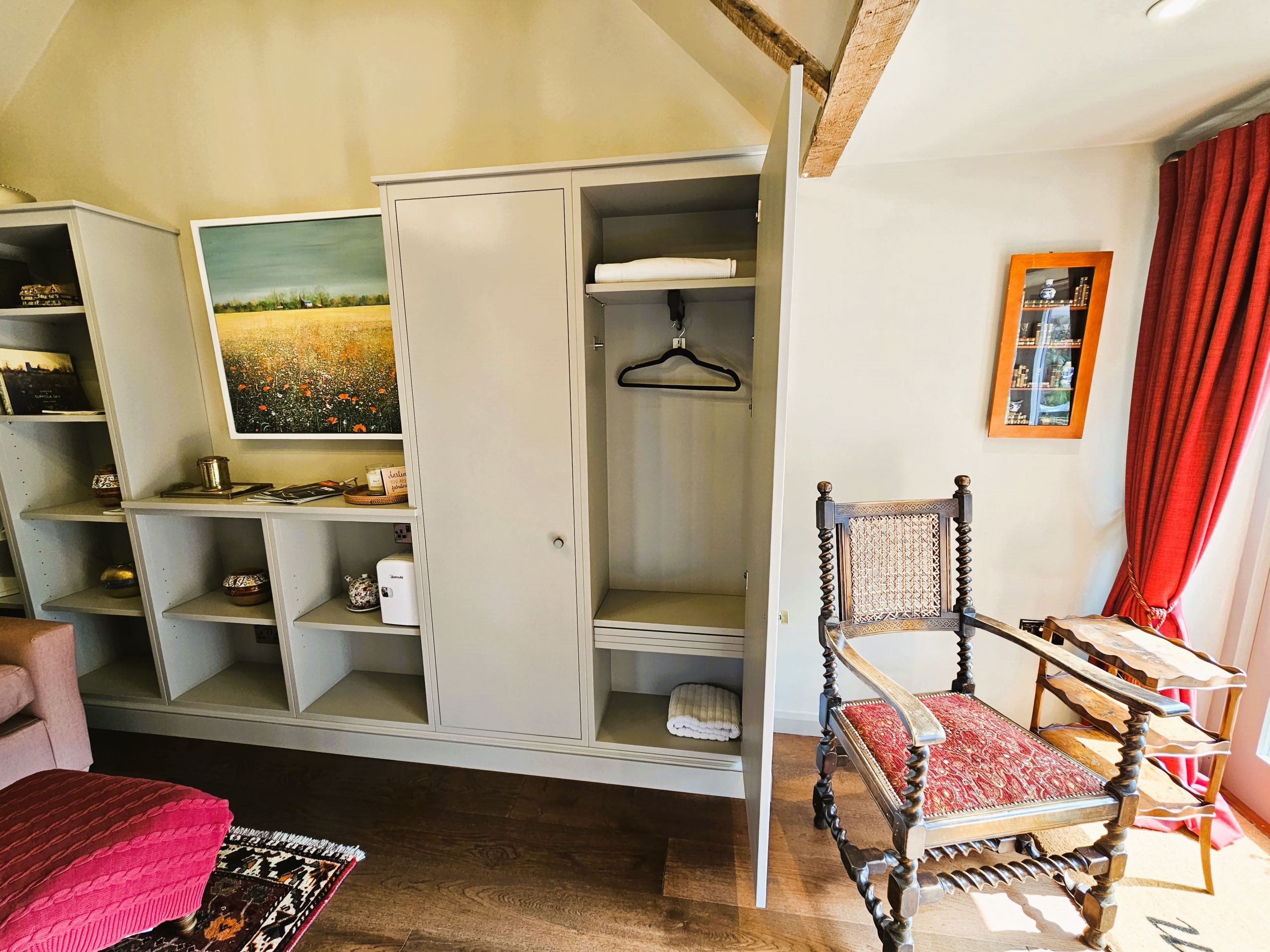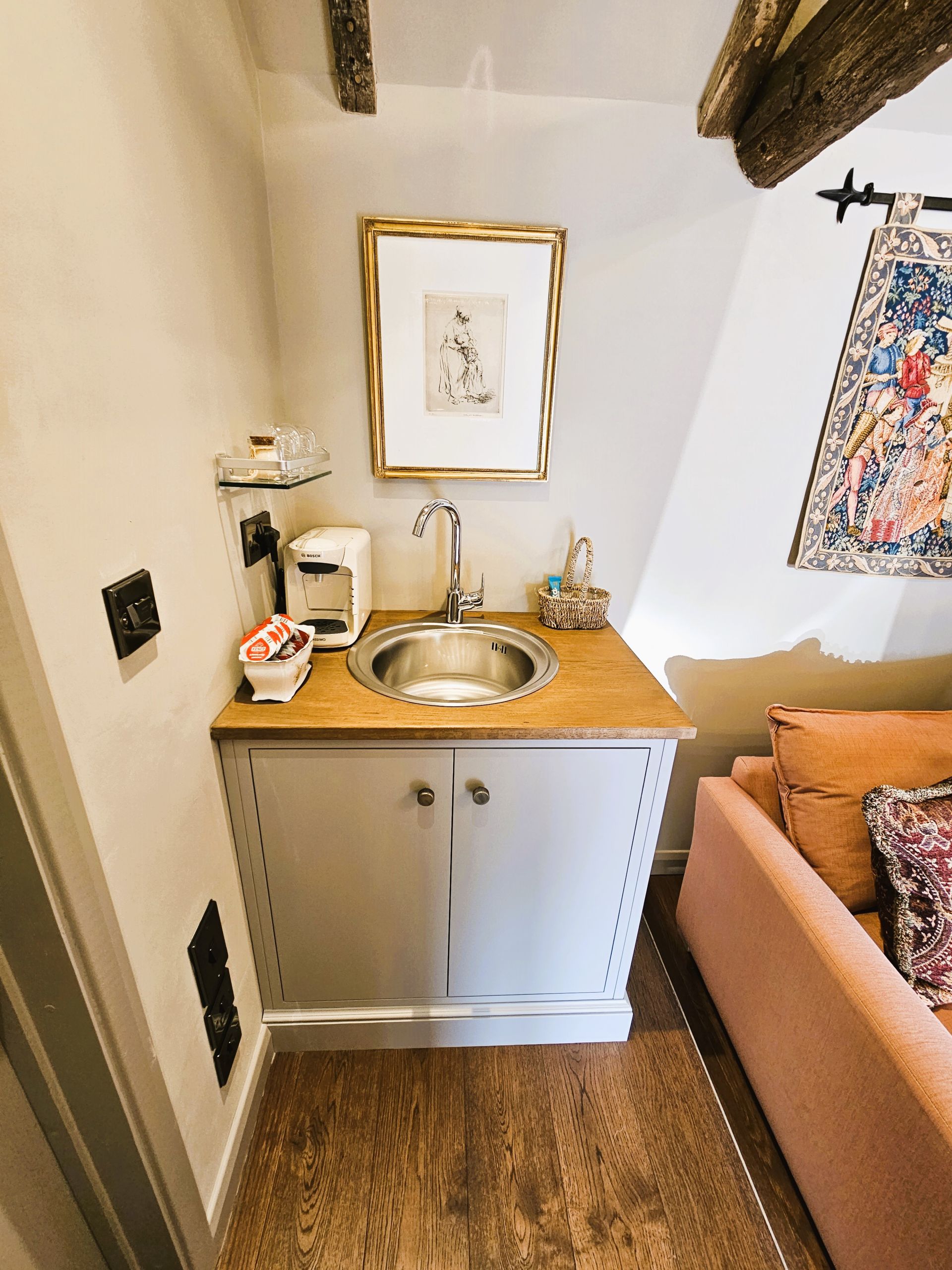 The cupboard complete with hanging rail and a little sink unit ensure a functional space for the guests staying here.