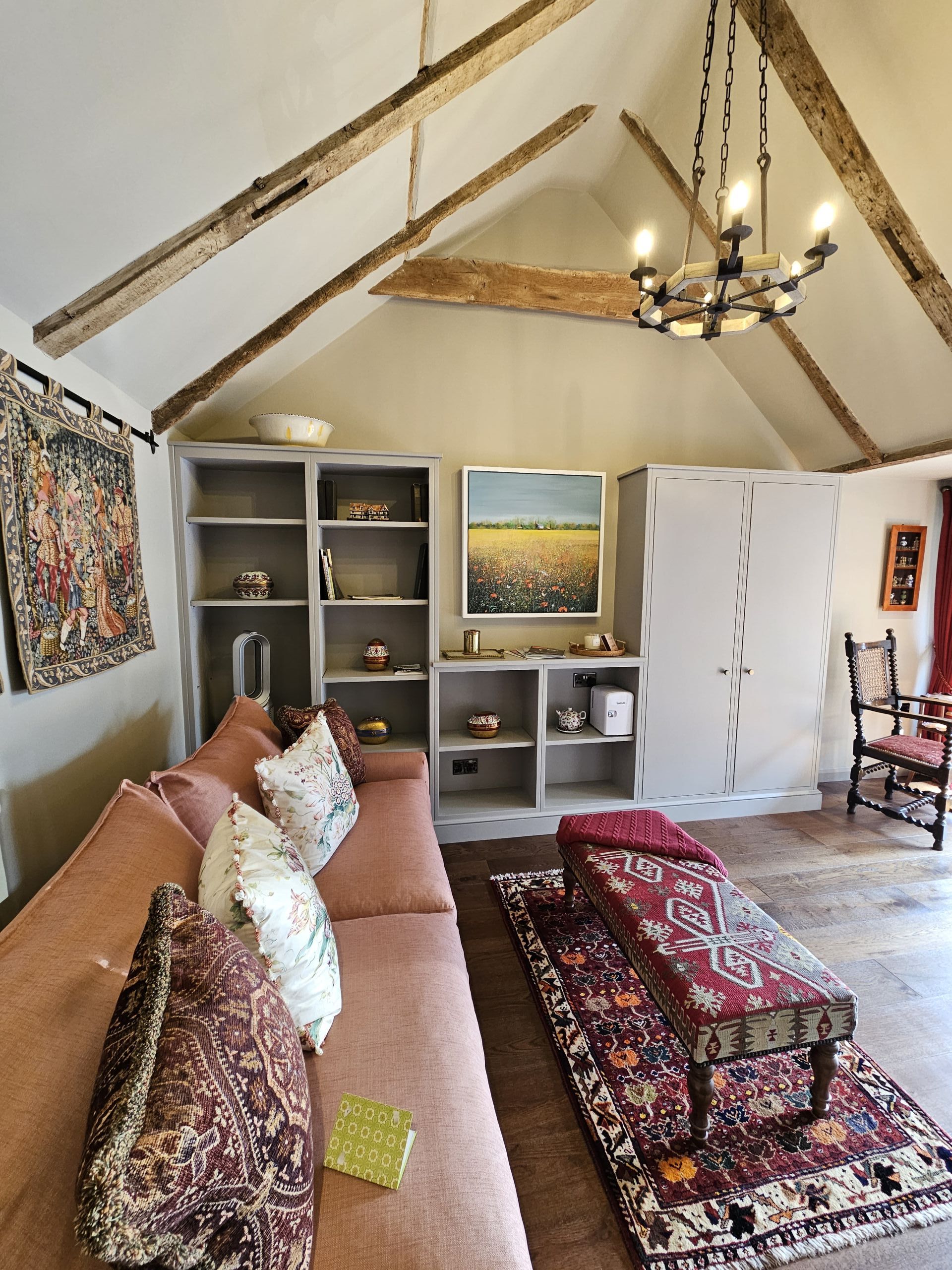 The clients artwork and bold fabrics really bring this small space to life, a lovely little hideaway in the Suffolk Countryside.