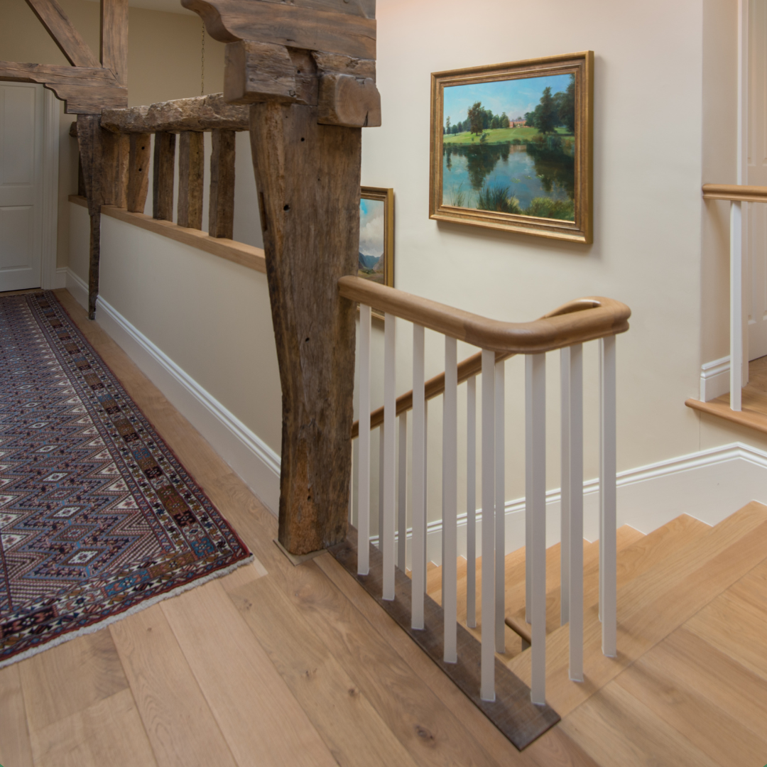 The Oak is even further enhanced by using a white painted finish on the spindles and risers, a stunning feature for this room.