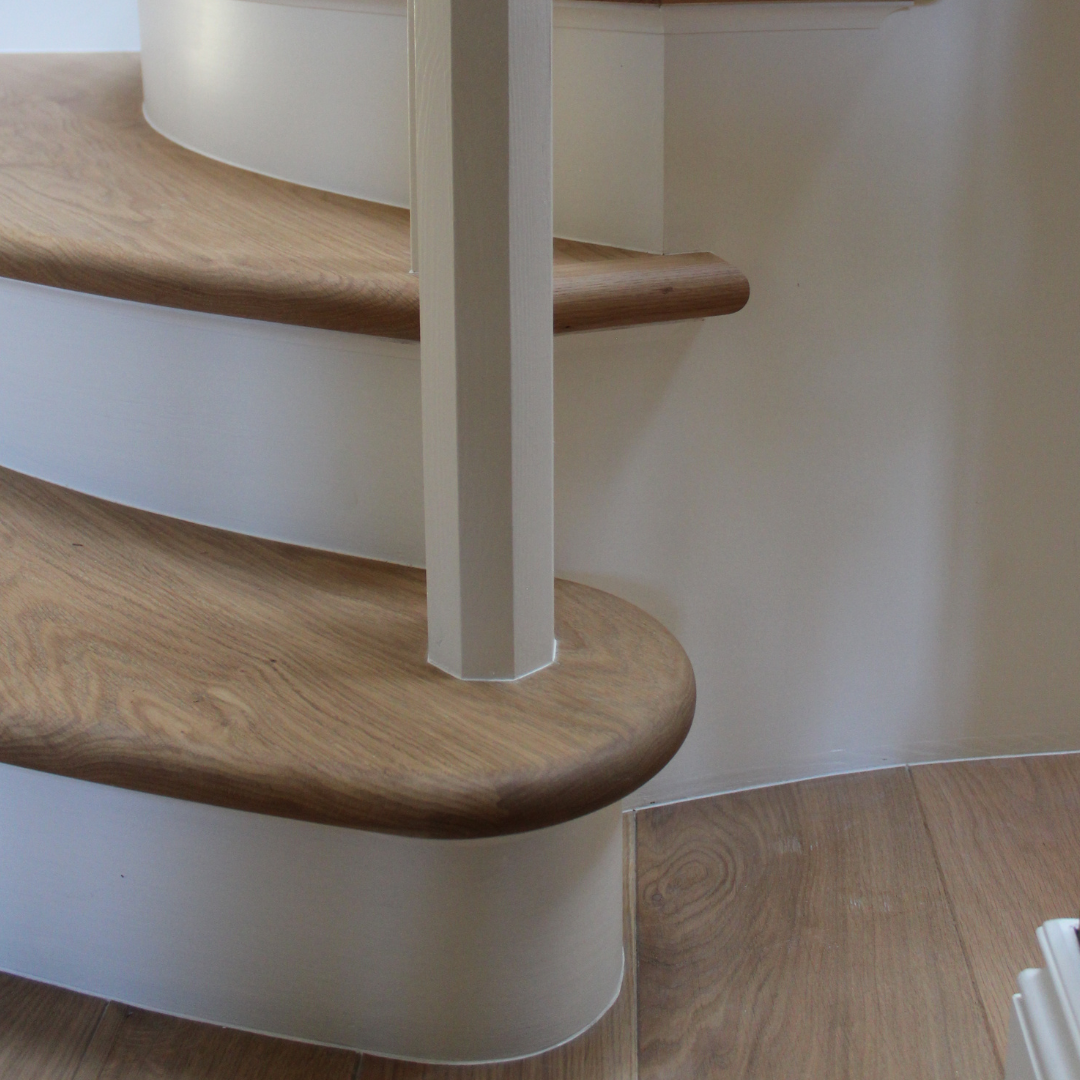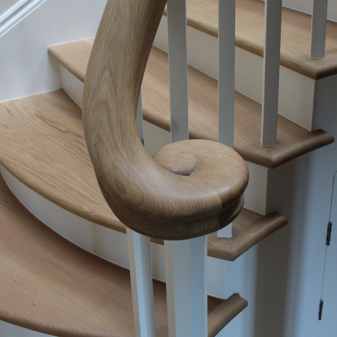 This hand finished staircase has a curved detail to create a softer feel and entrance into the room.