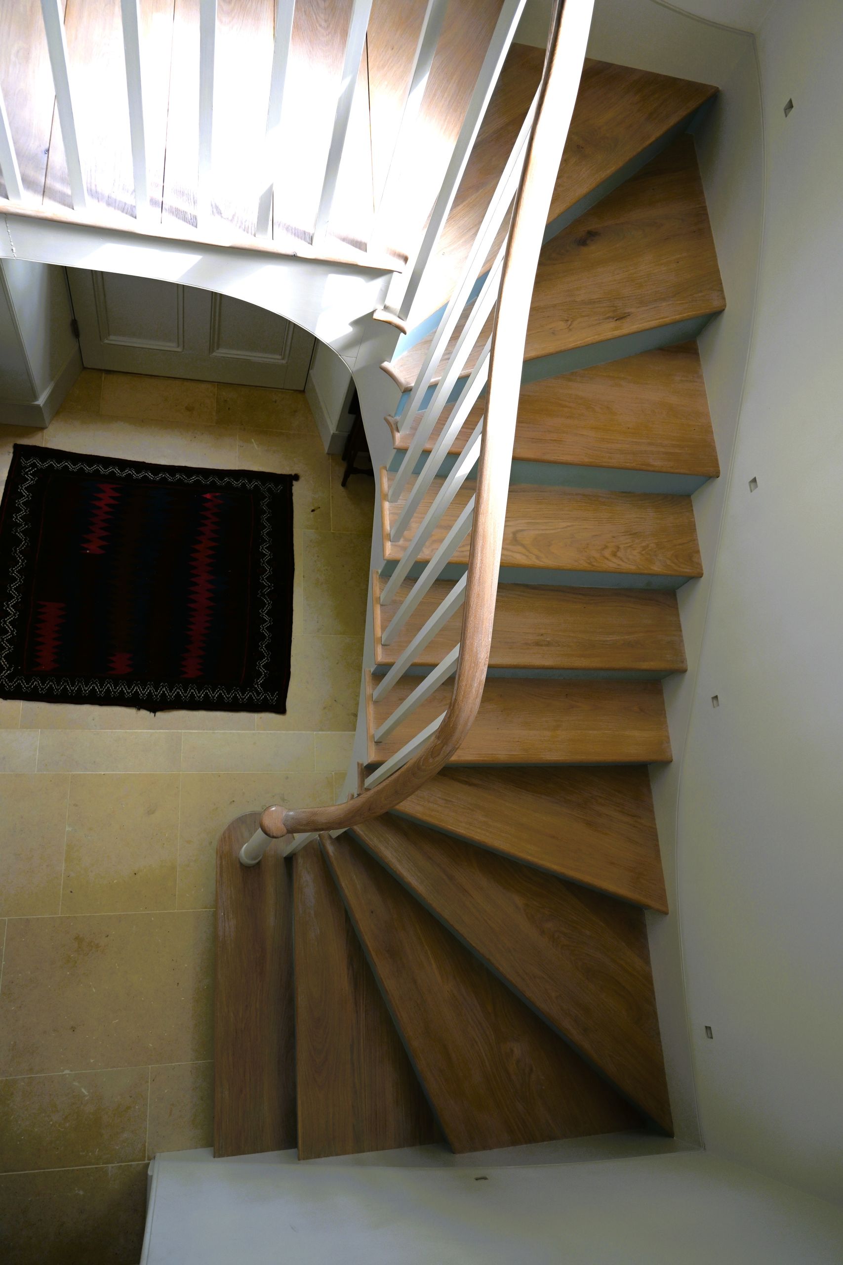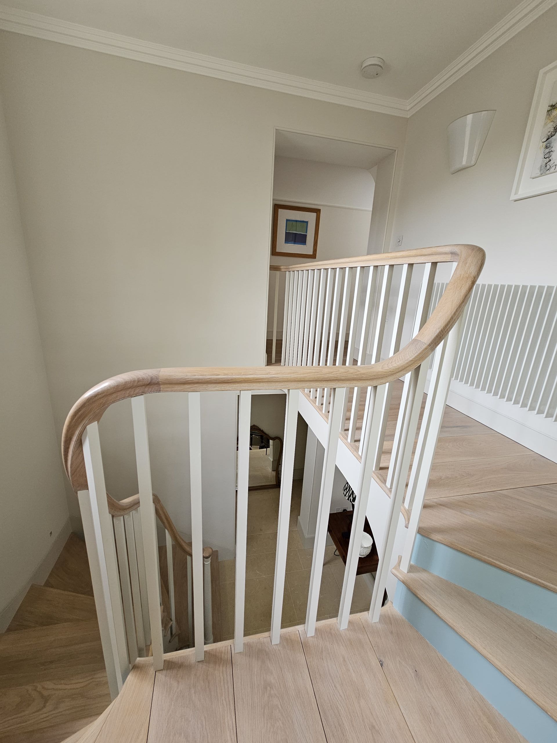 This sweeping staircase is fully bespoke, with Oak treads and hand rail that have been skilfully crafted to create the most elegant finish for our clients.