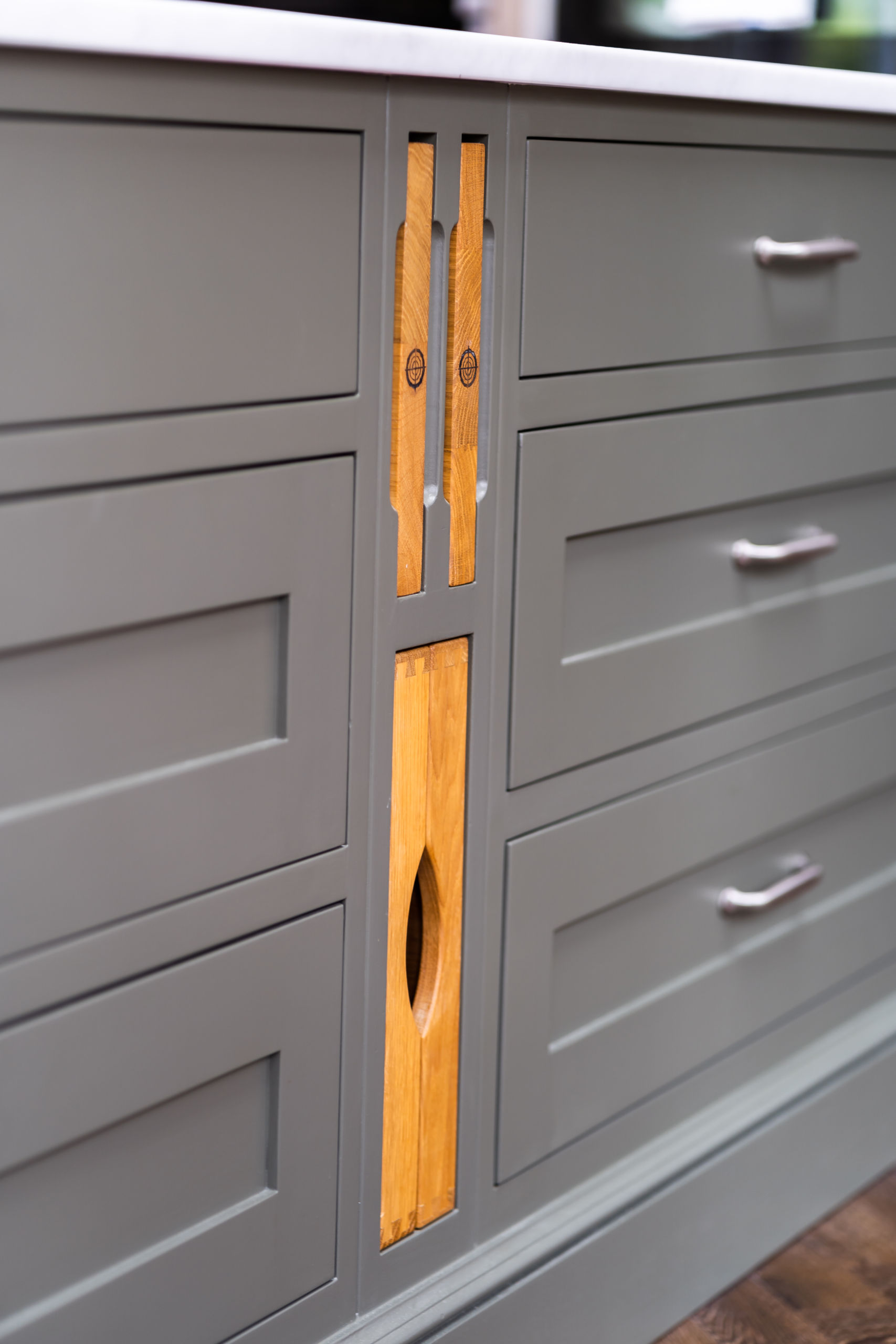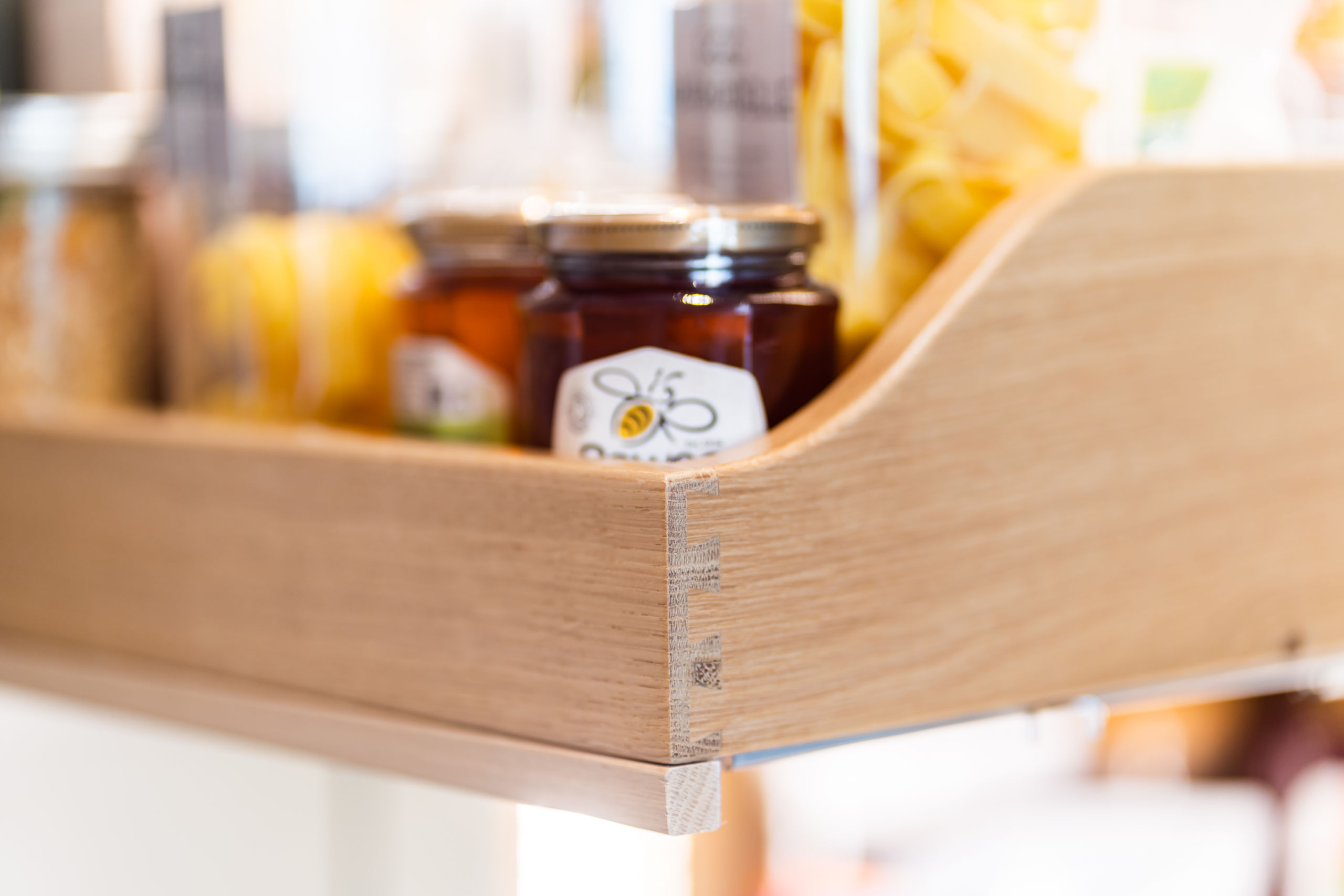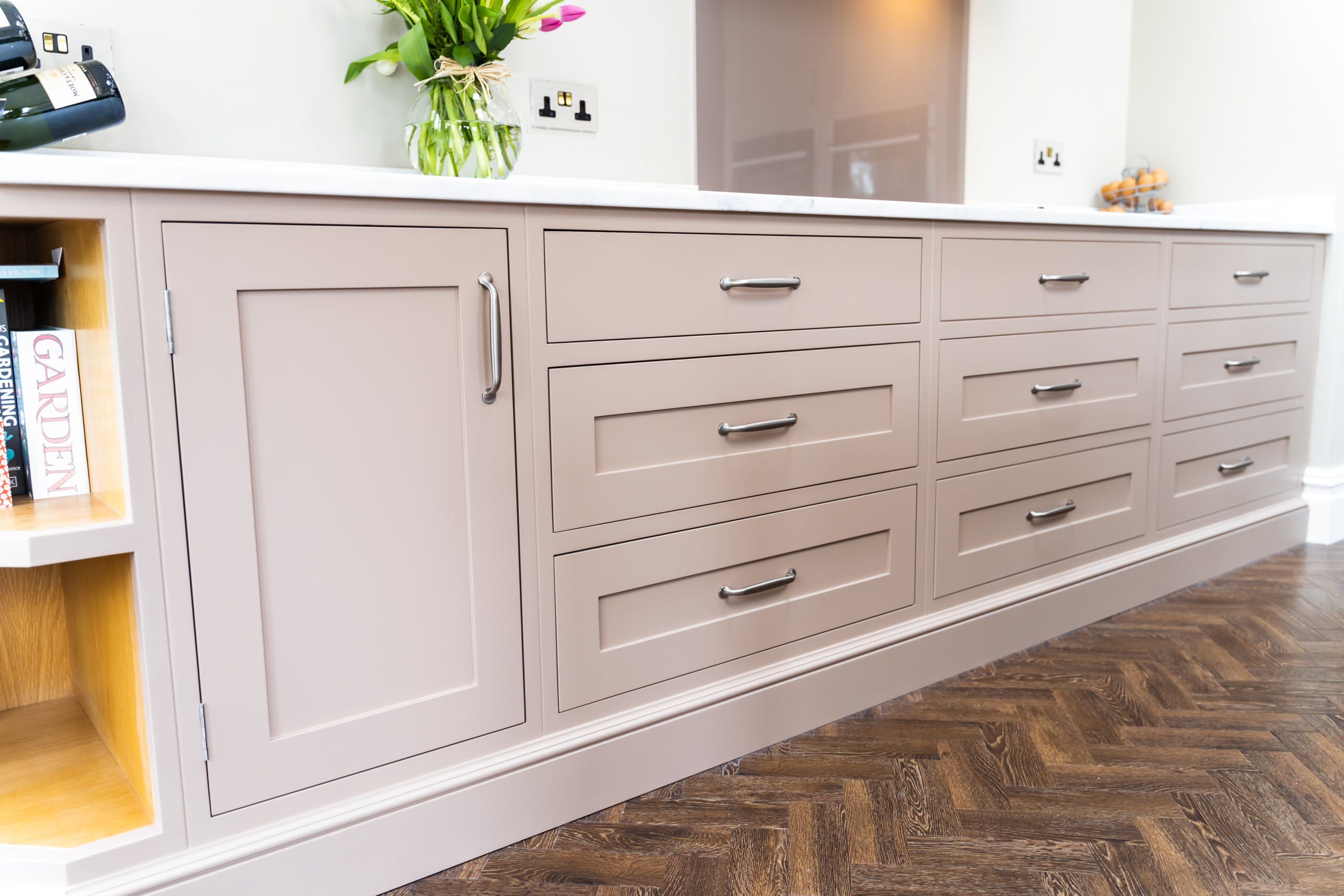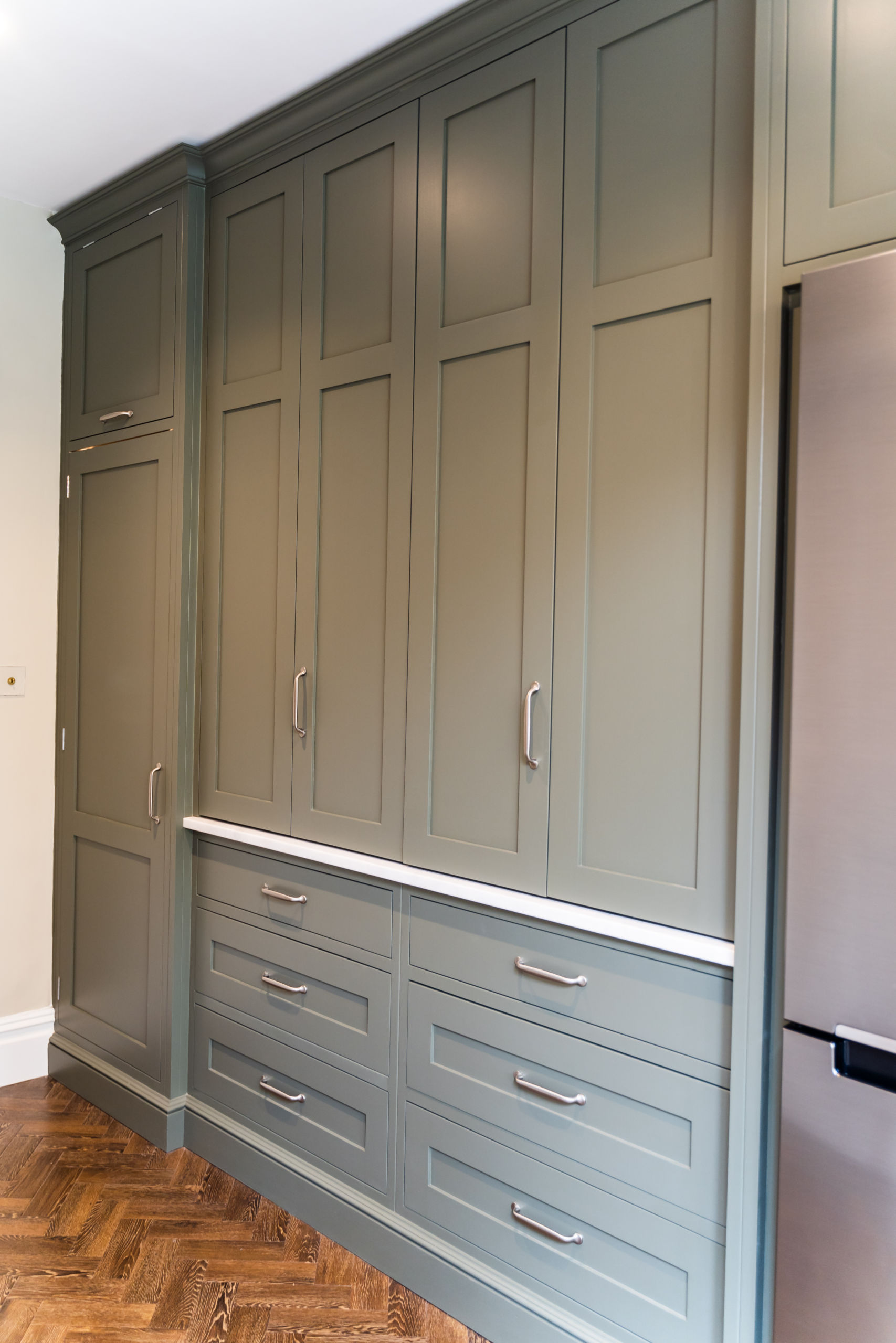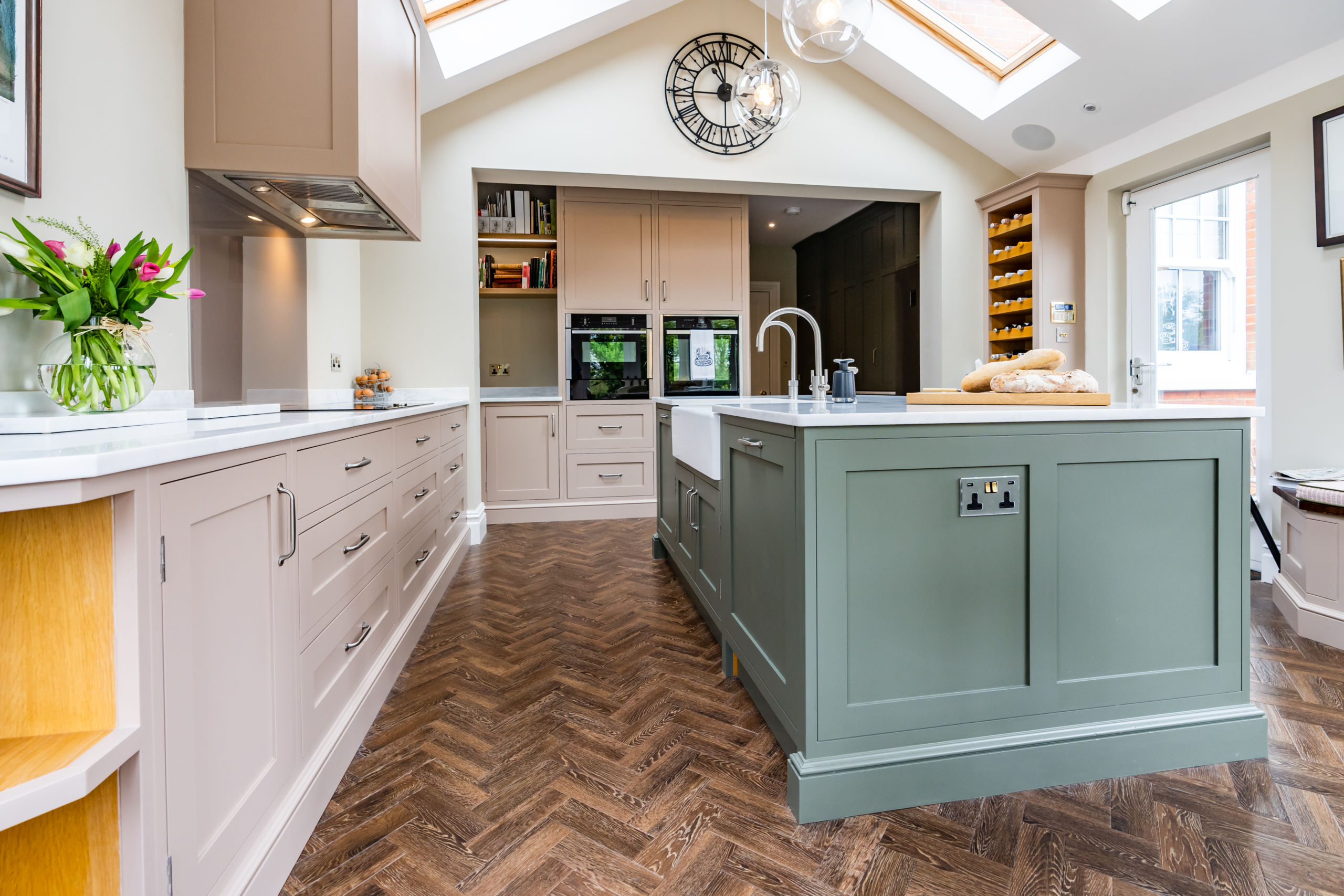 This bespoke kitchen was made for a client in the beautiful Bury St Edmunds, the kitchen is very in keeping with the style of the property. Our client has a flare for baking so we included a baking station into the larder area. She now has a designated space to create her delicious cakes and keep everything contained to one area.