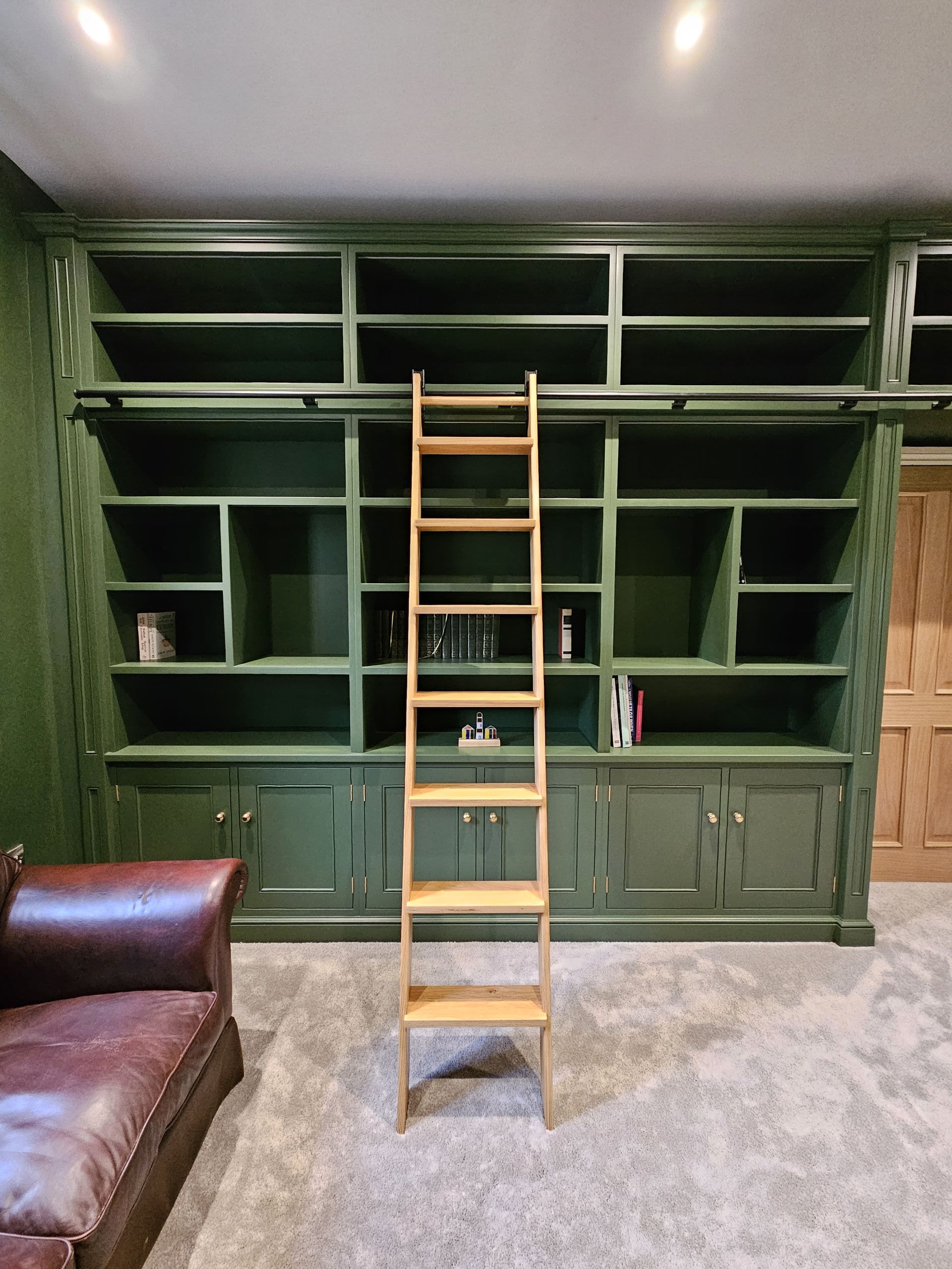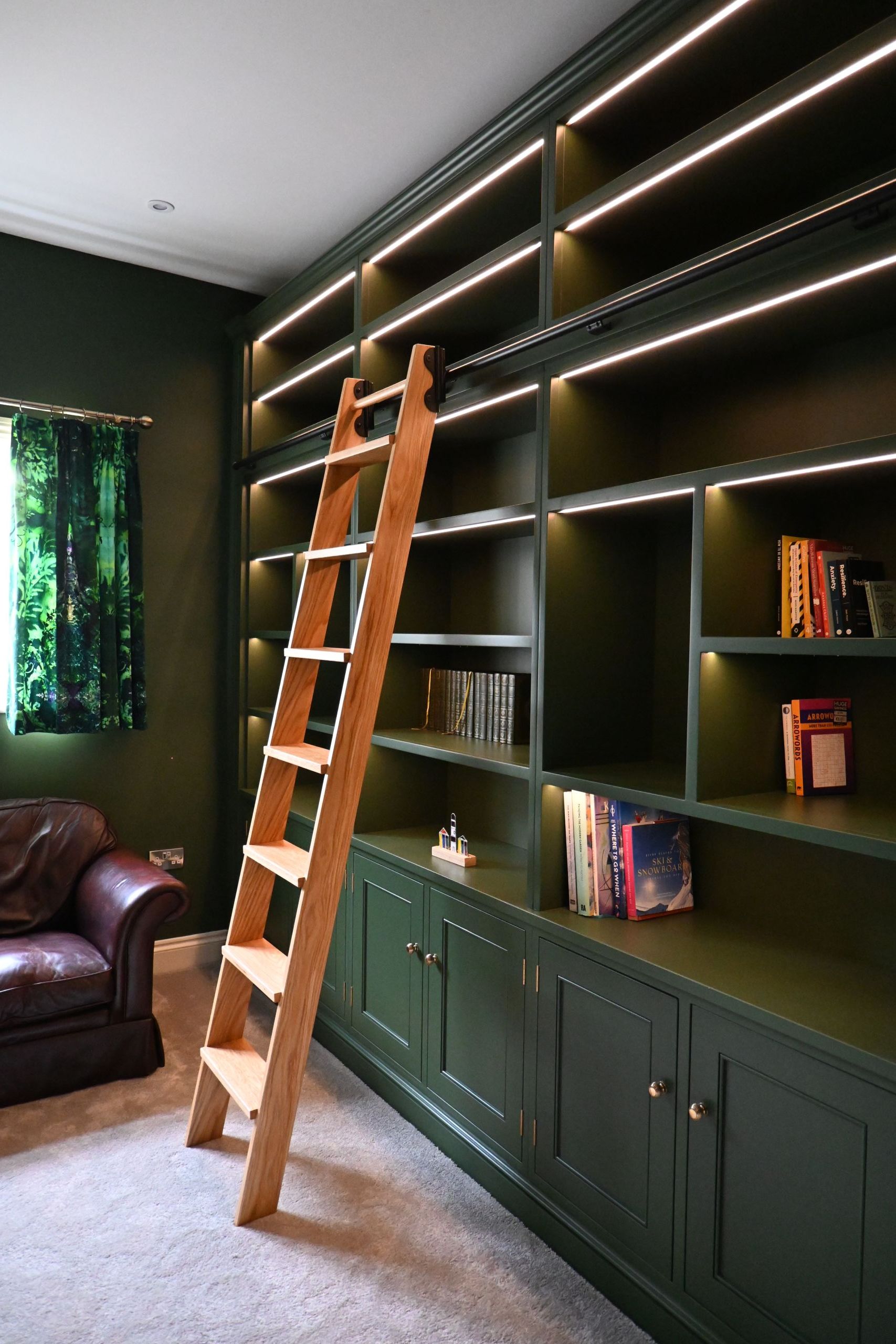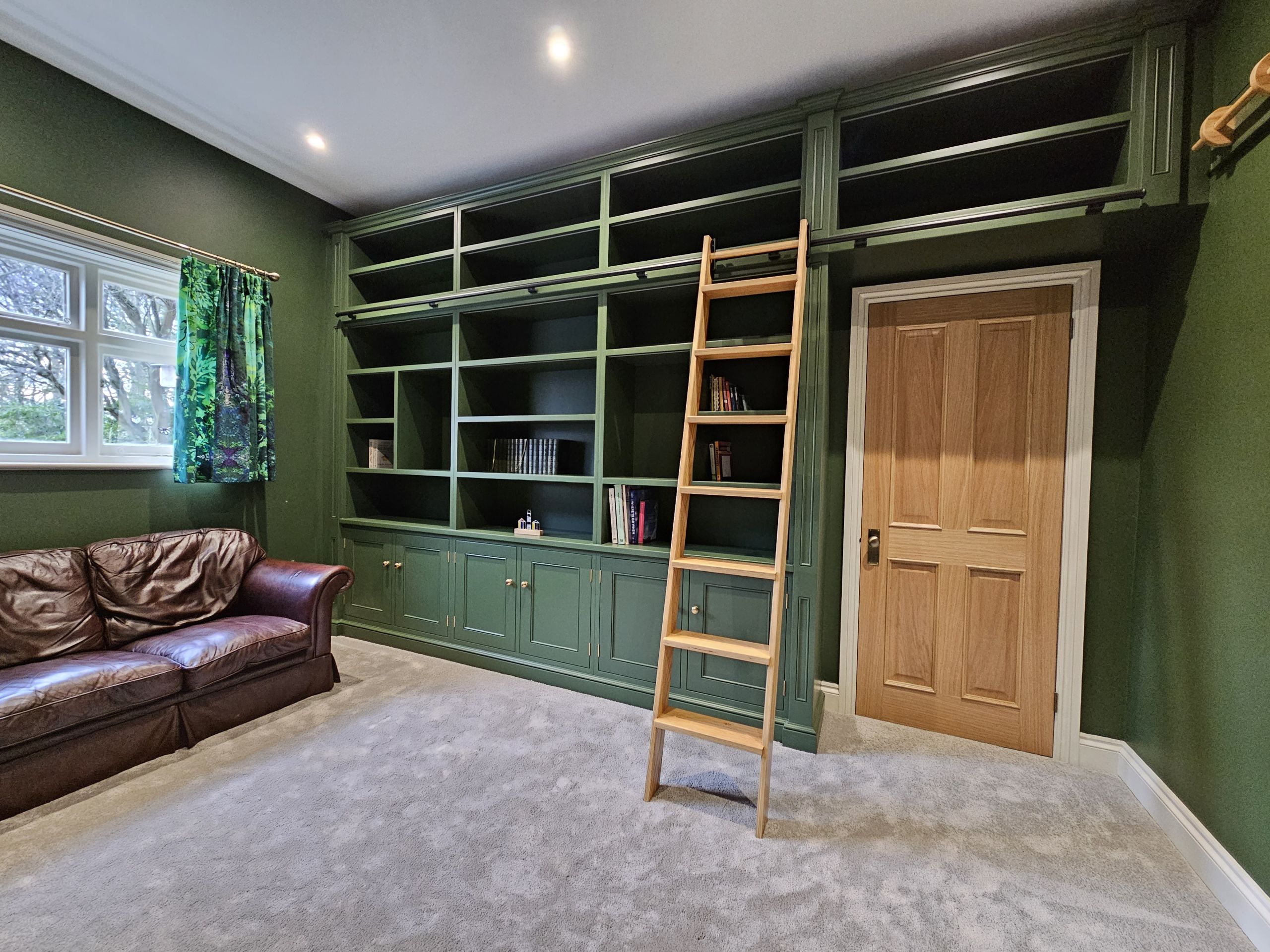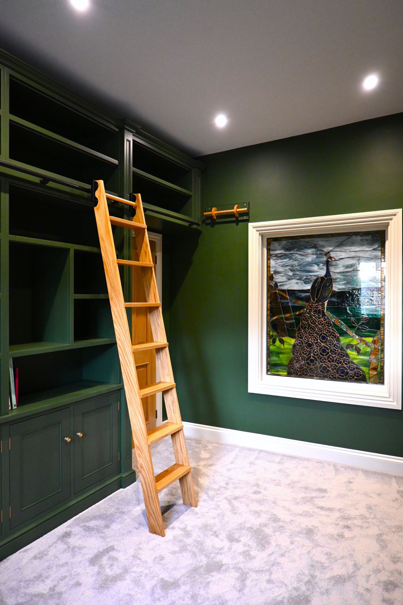 Custom floor to ceiling shelving, cleverly built around the doors and features of the room, have all been completed with rails for the hand made Oak ladder.