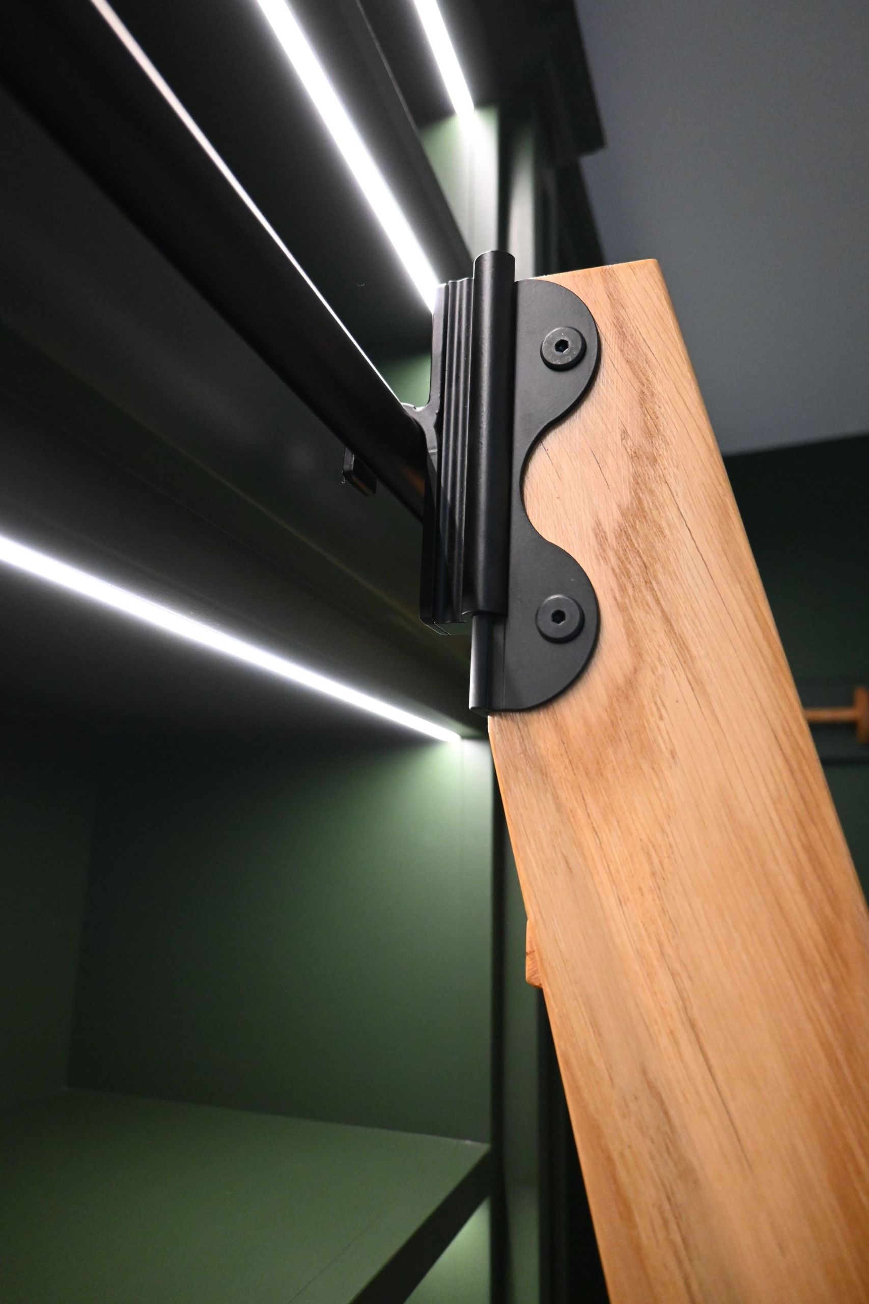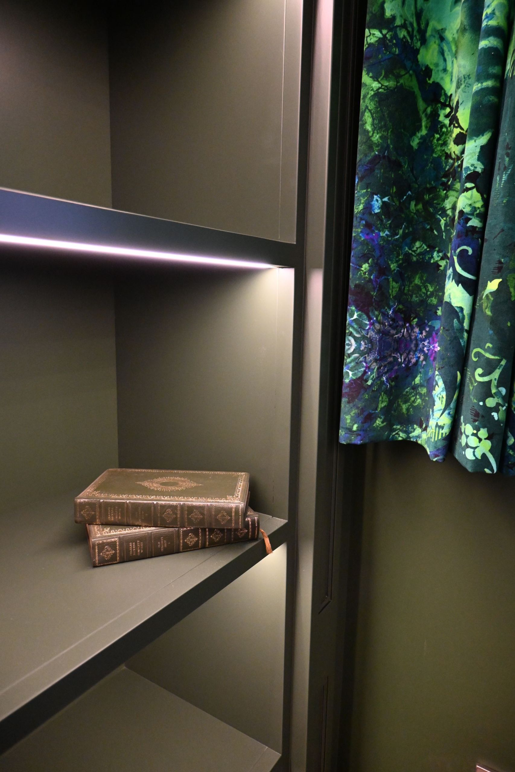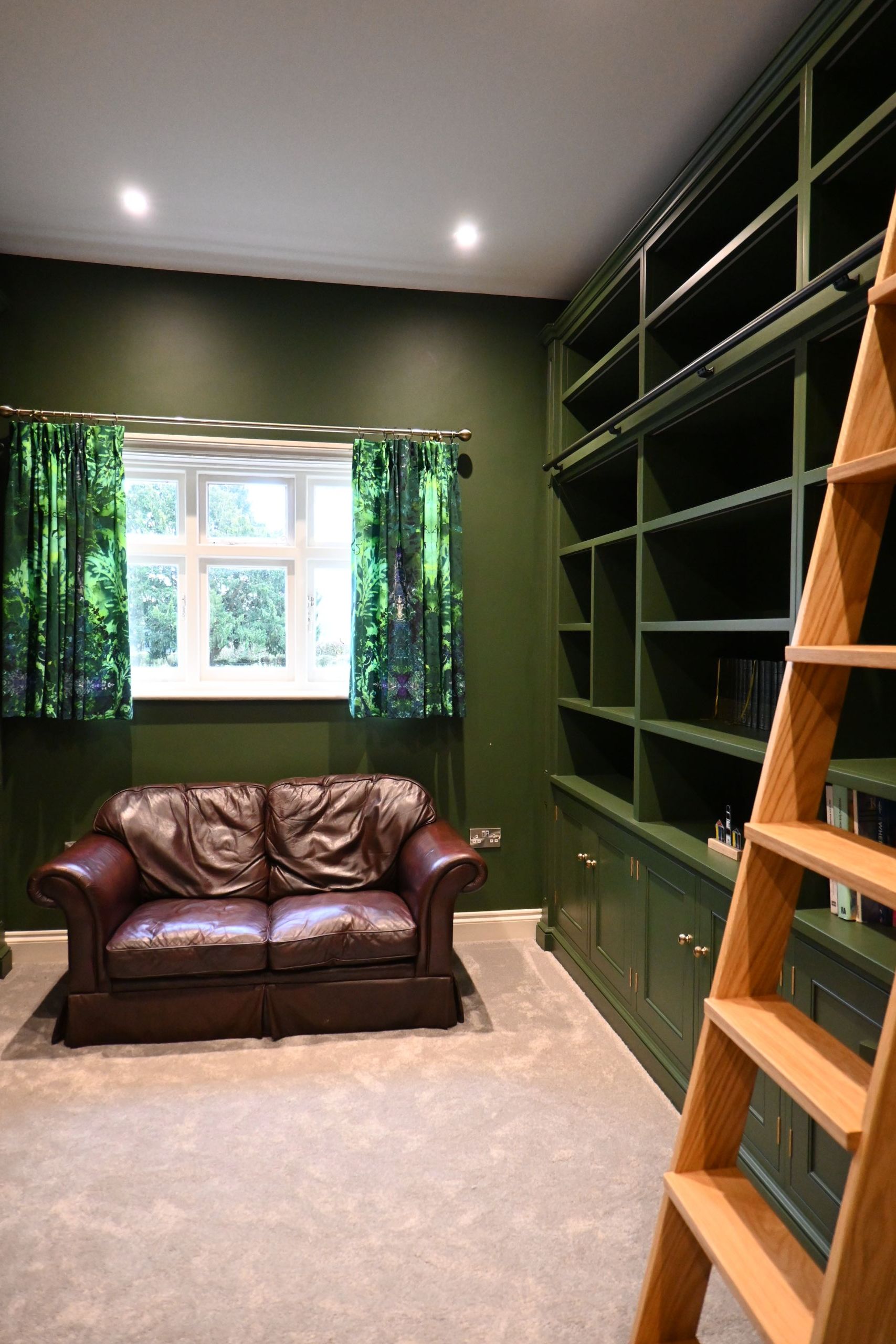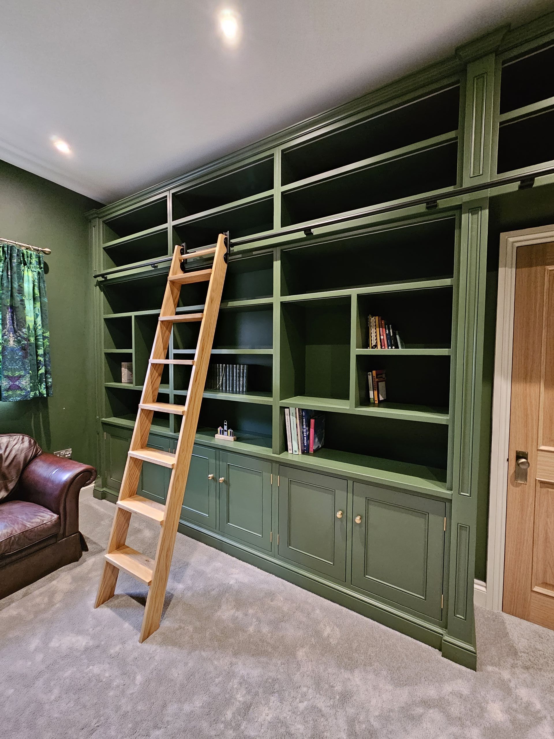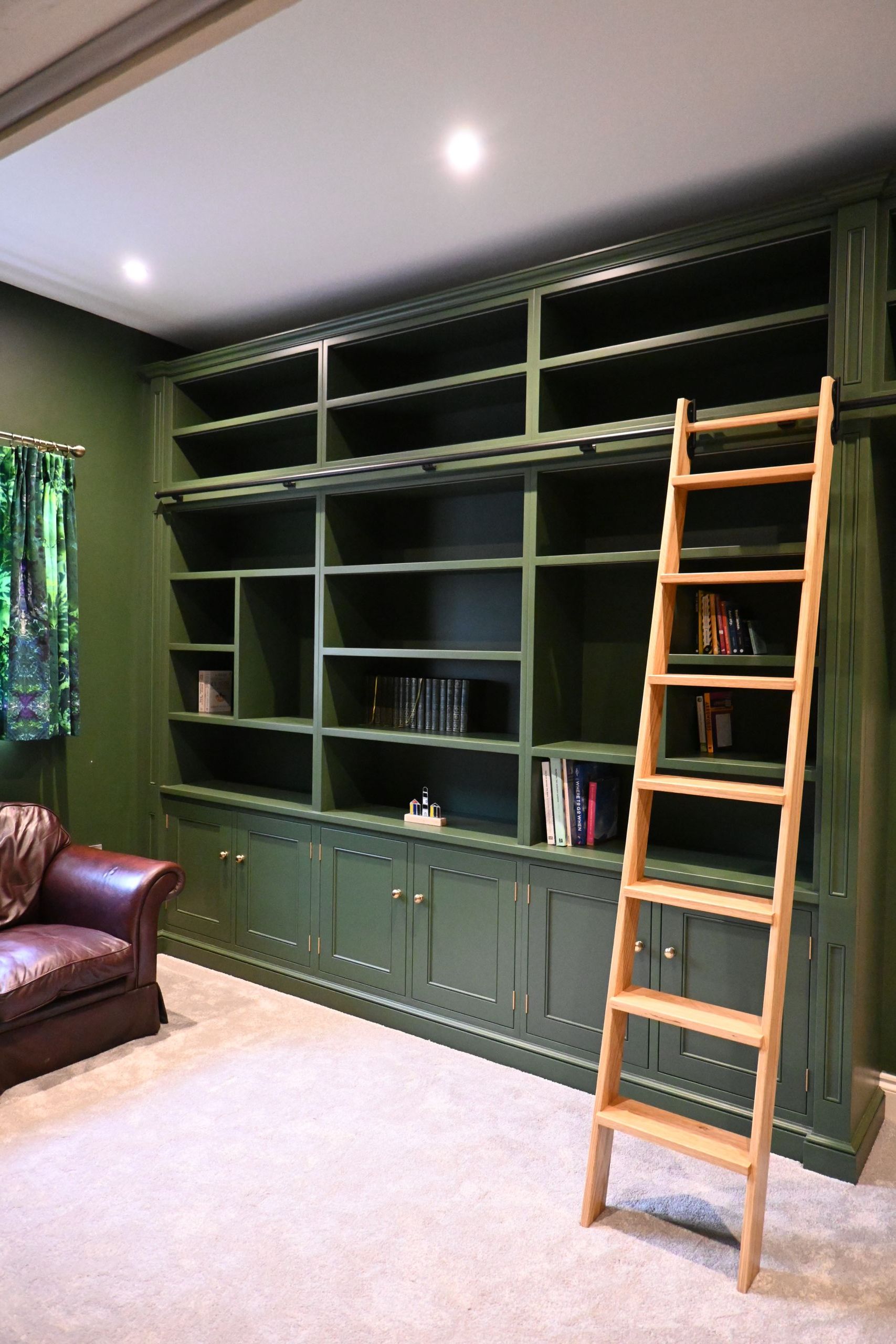 Custom floor to ceiling shelving, cleverly built around the doors and features of the room, have all been completed with rails for the hand made Oak ladder.